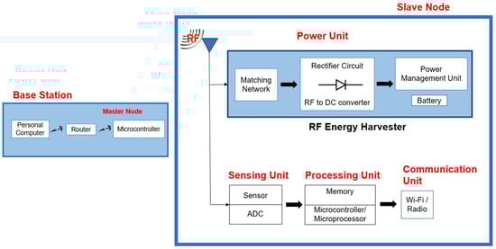 The master node is a so-called base station that includes a computer, router, and microcontroller. Other slave sensor nodes are linked to the master node. As illustrated in Figure 5, each slave sensor node comprises a sensor, microcontroller, and power unit. The sensor collects data from the environment and provides it to the microcontroller for processing. The slave node sends the data read from a sensor to the master node for additional processing and storage for real-time monitoring. Finally, the data received by the master node are saved on a personal computer for further study and timely action. The power unit could compromise the energy harvester to collect electromagnetic radiation for charging the battery. Experiments were conducted by employing four sensor nodes, one of which served as a master node and others are slave nodes.