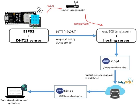 The program’s design includes a HyperText Markup Language (HTML) structure that specifies how the webpage should be displayed. The ESP32 must connect to the appropriate sensors to monitor the environment to complement successfully uploading the programming code. This idea aims to have a domain name and a hosting account that allows us to store sensor readings from the ESP32. It can visualise the readings from anywhere by accessing its own server domain. To build the charts, the Highcharts library was used. It shows two charts: temperature and humidity over time. The charts display a maximum of 70 data points, and a new reading is added every 30 s. The capability of data points can be changed at any time in the code. The web client may access the data through a web browser thanks to the design of an Internet of Things network for temperature and humidity monitoring and its implementation using a web server. Figure 6 depicts the high-level overview of hosting PHP applications and MySQL database.