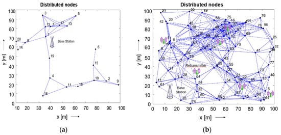 Distributed number of nodes, 20 and 80, in (a,b), respectively. Area length = 100 m, area width = 100 m, expected sensor reading = 100, and size of the data packet = five bytes.
