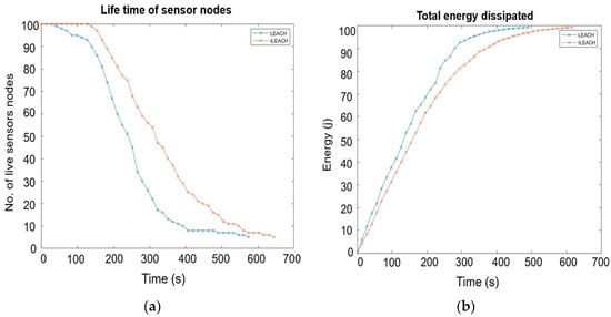 Comparisons of lifetime and average energy consumption of sensor nodes between standard LEACH and improved LEACH protocol in (a,b), respectively.