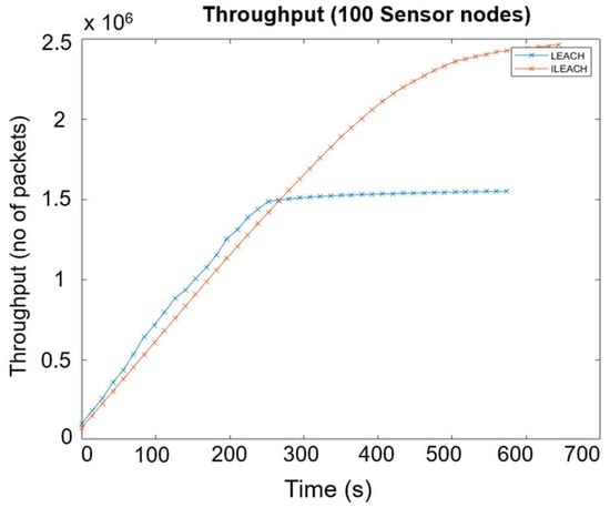 The simulation results indicate that the proposed clustering approach is more energy-efficient, scalable, and effective in prolonging the network lifetime compared to the LEACH protocol. Figure 8a shows the simulation result of the lifetime of 100 sensor nodes (number of live sensor nodes vs. time), Figure 8b shows the simulation result of average energy consumption (energy vs. time), and Figure 9 shows the simulation result of the throughput between the LEACH and I-LEACH of 100 sensor nodes (number of packets vs. time). At the end of the simulation, the performance of the proposed I-LEACH protocol was evaluated. The data in Figure 8b and Figure 9 prove that I-LEACH improves the energy consumption by around 43% and throughput by 40% in a 100-node network size.