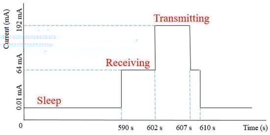 For data transmission, to monitor the receiving (Rx) and transmitting (Tx) mode current, an approach of 10 min intervals was presented, and the voltage difference between the Rx and Tx mode was measured with an oscilloscope. The voltage difference (V) of 640 mV and 1920 mV for Rx and Tx modes was measured. Assuming a resistor (R) of 10 Ω (ohms) connected in series, the current consumption of 64 mA for Rx mode and 192 mA for Tx mode was calculated. Figure 10 depicts the timing diagram of the sensor node operation regime.