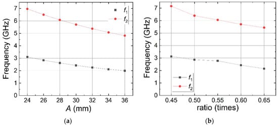 Additional investigation was performed into how the working frequencies of the fractal antenna depend on its two main parameters—the size of the largest triangle and the edge ratio of other triangles. The upper limit of the parameter space is limited by the size of the PPE440 substrate. All other parameters are fixed. The simulation results are presented in Figure 12—the increase in the size of the triangles or the ratio between the triangle edges decreases the antenna resonance frequency in both bands. The dependences are close to linear. The ratio between the two frequency bands increases from 2.24 to 2.41 when A increases, and from 2.29 to 2.53 when the ratio between the triangle edges increases. This allows us more precise control of the resonance frequencies of both bands by choosing proper dimensions of the antenna and slight separate tuning of both resonance frequencies.
