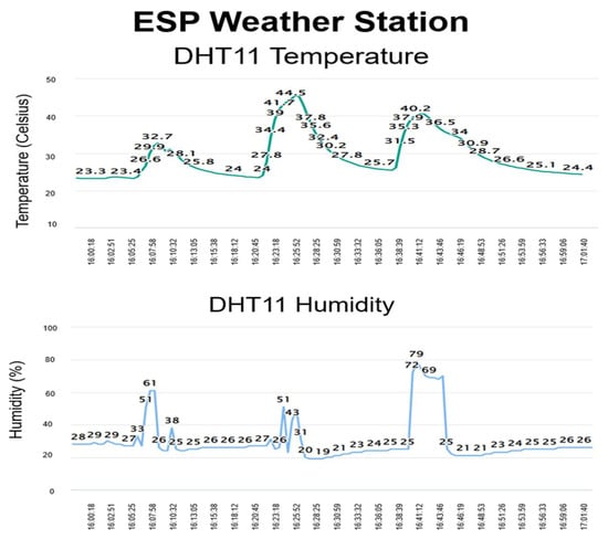 The sensor readings are displayed on the server, which can be accessed anywhere. The created database shows the result of the DHT11 sensors in two real-time charts: one shows the temperature readings, and the other shows the humidity readings. Figure 13 displays the outcome of a web client monitoring the temperature and humidity in a web server.