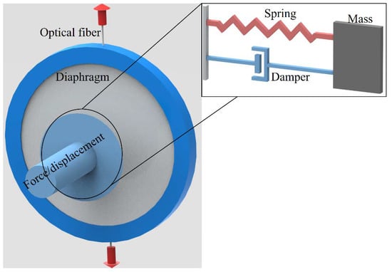As we investigate the influence of displacements and forces inputs on the diaphragm-embedded FBG, the diaphragm properties are also considered in the analysis. In this case, a rubber diaphragm was used, which presents a viscoelastic response represented by a non-constant relation between stress and strain, as discussed in ref. [28]. Among many models of viscoelastic materials, the Maxwell’s model relates the elastic and viscous components of the materials’ responses with spring (for the elastic component) and dampers (for the viscous component) [25]. For this reason, there is a non-constant relation between the stress and strain applied on the diaphragm, especially when the dynamic responses are considered. In addition, the force or displacement applied on the diaphragm are transmitted to the optical fiber, as shown in Figure 1, where a transversal input in the diaphragm generates strain components on the longitudinal axis of the optical fiber. Such stress/strain transmissions are proportional to the materials’ (diaphragm and optical fiber) Poisson’s ratio. Moreover, the spring–damper representation of the diaphragm material (following Maxwell’s model) is presented in Figure 1 inset.