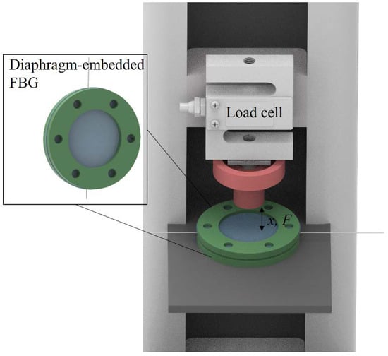 Figure 2 presents the experimental setup for the force and displacement evaluations, where Figure 2 inset presents the schematic representation of the diaphragm structure. In this case, the diaphragm (with embedded optical fiber) structure is positioned on a compression machine comprised of a strain gauge and a displacement sensor to evaluate the wavelength shift and reflected optical power variations as a function of the applied displacement and force. The FBG-reflected spectra and their features (Bragg wavelength and reflectivity) were acquired with the optical interrogator sm125 (Micron Optics/Luna, USA). For the displacement assessment, 5 loading/unloading cycles were performed in the range of 0 to around 3 mm, whereas other 5 tests were performed in the range of 0 to around 13.5 N for the evaluation of the force influence on the sensors responses.