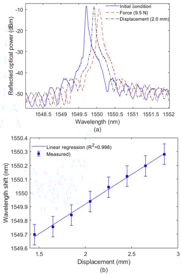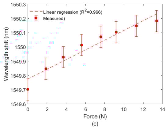 The results in Figure 4b,c indicate different sensitivities of wavelength shift for the displacement and force. When the wavelength shift was analyzed, sensitivities of 431.2 pm/mm and 34.1 pm/N were obtained for displacement and force, respectively. The results in Figure 4 also show the determination coefficient (R2) in the regression between wavelength as function of force (and displacement).
