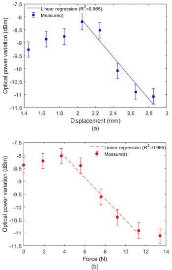 Similarly, as shown in Figure 5a,b, the reflected optical power also presented different sensitivities to displacement and force, where −3.3 dBm/mm and −0.41 dBm/N were estimated for displacement and force, respectively. However, the optical power variation presented a linear response only in a limited range between around 2.0 mm and 2.8 mm for the displacement, shown in Figure 5a, whereas the range of linear response for force detection was around 4.0 N to 11.0 N. It is worth noting that there is another region with a linear range, from 1.4 mm to 1.8 mm and 0 to 4 N that also could be used in the force–displacement simultaneous assessment. However, this region was not used in this work, since the other region (from 4 N to 11 N) represents a higher measurement range. The optical power attenuation analysis was performed to obtain additional data on displacement and force with a single FBG. If a measurement of displacement or force is desired, i.e., only one of the two variables, the optical attenuation analysis is unnecessary, since higher correlation is found in the wavelength shift as a function of the force or displacement. However, if both variables (force and displacement) need to be simultaneously measured with a single FBG, we need additional spectral data to obtain a system with two data and two variables. Thus, the optical attenuation results presented in Figure 5 are used only when the force and displacement need to be simultaneously measured with a single FBG.