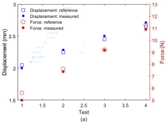 Following the force and displacements characterizations, the simultaneous assessment of both parameters was performed by applying the sensitivity parameters in Equation (4) and with the spectral features, reflected optical power, and wavelength shift in the regions at which there was a linear regression of both wavelength shift and reflected optical power as a function of force and displacement. The matrix determinant was calculated, since for the displacement and force estimation, the sensitivity matrix should be inverted. In this case, the matrix determinant was −0.12, which indicates that the matrix had an inverse and shows that there was no linear dependency between the matrix’s elements. Figure 6a shows the force and displacement estimation results using the proposed approach, where the displacement and force sensitivities were applied in Equation (4) within the linear range of both parameters. The results were compared with the parameters measured by the displacement and force sensors (strain gauge) of the experimental setup (see Figure 2). The results indicated a good agreement between the estimated results (from the FBG response) and the reference sensors due to the small root mean squared error (RMSE) of 0.05 mm and 0.37 N for displacement and force, respectively.