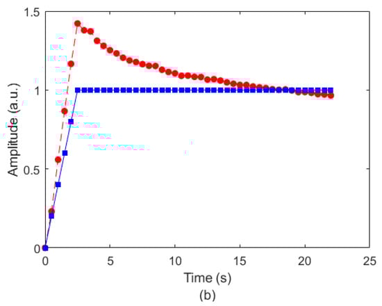It is worth mentioning that the force application leads to a displacement on the material (and vice-versa) due to the stress–strain relations of the material. Thus, the analysis of the sensor’s response to displacement and force can enable the assessment of the delay (or phase shift) between the stress and strain as well as the creep behavior. In this case, a step displacement was applied, where force and displacement were normalized as shown in Figure 6b. The results showed a shift between force and displacement, which can be correlated with creep and stress relaxation responses in viscoelastic materials, as presented in ref. [32]. Such relaxation in the force response is transmitted to the optical fiber and indicates the possibility of using FBGs as a tool for in situ material analysis.