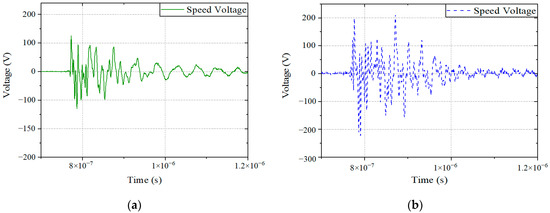 The time domain signal of the speed voltage: (a) Electric field strength is 10 kV/m; (b) Electric field strength is 20 kV/m.