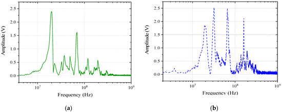 The frequency domain signal of the speed voltage: (a) Electric field strength is 10 kV/m; (b) Electric field strength is 20 kV/m.