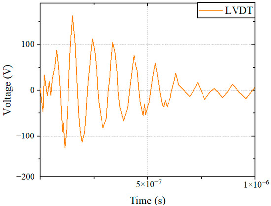 During the pulse current injection experiment, the voltage signals of the speed, displacement, and power port of the main fuel regulation controller were monitored to obtain the coupling signal of the system under the action of a strong electromagnetic pulse. By analyzing the voltage signal, the sensitivity threshold of the sensors was obtained. When a 10 MHz pulse current was injected into the LVDT connection beam, the LVDT port monitoring voltage of the controller is shown in Figure 9.