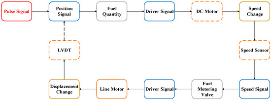 To compare and analyze the electromagnetic pulse coupling of sensors, this paper analyzed the sensitivity of the LVDT sensor in the pulse current injection test. When the sensitivity phenomenon occurs, the differential mode voltage between the LVDT detection ports was 53.6 V. According to the control strategy of the main fuel regulation control system, the speed of the DC motor will increase, resulting in a change in the simulated engine speed collected by the speed sensor. In addition, the amplitude of the voltage signal increases. Simultaneously, to control the change in the engine speed, the system controls the output level of the linear motor, reduces the opening of the fuel pump valve needle, and reduces the amount of simulated fuel. Thus, the position of the simulated fuel pump valve needle changes, the displacement of the linear motor is shortened, the amplitude of the voltage signal collected by the LVDT is reduced so that the rotation speed of the DC motor is reduced, and the closed-loop control of the speed and displacement is completed, as shown in Figure 10. Through the analysis of the test results, the sensitivity threshold of the main fuel regulation control system under the action of a strong electromagnetic pulse was obtained.