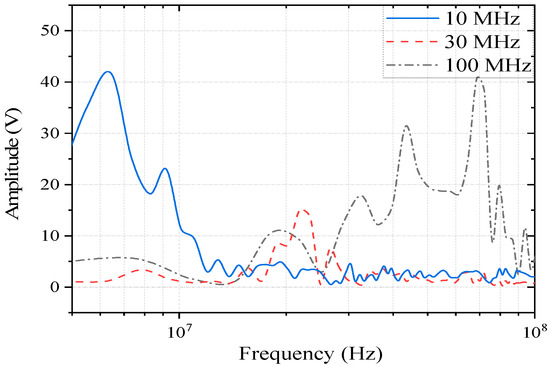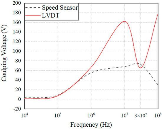 To explore the electromagnetic sensitivity characteristics of the speed sensor and LVDT sensor of the controller under the action of a strong electromagnetic pulse, pulse current injection tests were carried out on the two sensors based on the radiation test. The speed sensor controller terminal coupling voltage signal at the frequency domain is shown in Figure 7 and Figure 8. Based on the same current distribution of the controller terminal, pulse current signals of different frequencies are selected for injection into the system, and the voltage signal of the LVDT sensor port is monitored. The LVDT controller terminal coupling voltage signal at the frequency domain is shown in Figure 13. When we select the frequencies of the current signal at 10 kHz to 1 MHz to inject, the voltage signal of the LVDT sensor port is very small. The signal will not exhibit a distinct resonant frequency; it has no impact on the subsequent analysis of the sensors, so it is not shown in Figure 13.