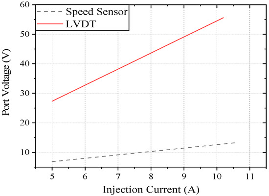 A pulse current of 30 MHz was selected and injected into the connection beam of the speed sensor and the LVDT sensor to monitor the coupling voltage signal of the speed port and LVDT port of the controller, as shown in Figure 14. There is a large difference in the amplitude of the coupling signal collected by the two sensors under the impact of an electromagnetic pulse. To further examine the electromagnetic sensitivity of the two types of sensors under the action of a strong electromagnetic pulse, this study conducted multifrequency pulse current injection tests on the rotational speed sensor and the LVDT connection beam to monitor the amplitude of the coupling signal of the controller at 10 kHz, 100 kHz, 1 MHz, 10 MHz, 30 MHz, and 100 MHz. The curves were numerically fitted through six points, as shown in Figure 15.