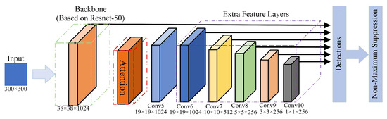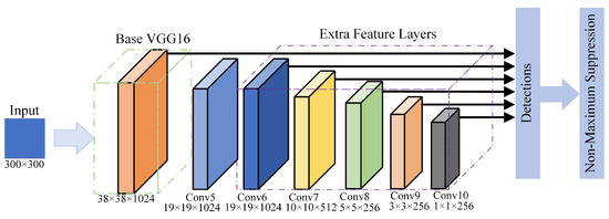 Single Shot MultiBox Detector (SSD) [12] is a representative single-stage detector, which consists of a VGG16-based backbone structure and extra feature layers. It combines the advantages of Faster R-CNN and YOLO, and it has a great improvement in model structure and operation speed. The network structure of the original SSD is shown in Figure 1.