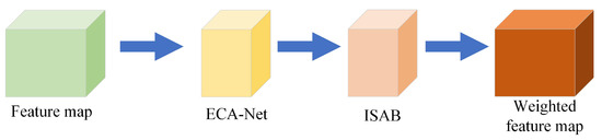 The attention mechanism proposed in this paper is composed of two attention modules, ECA-Net [17] and ISAB (Improved Spatial Attention Block). As shown in Figure 4, the ECA-Net is a channel attention mechanism and ISAB is a spatial attention mechanism. Referring to the connection between the channel attention mechanism and the spatial attention mechanism of CBAM [18], the accuracy of target recognition can be improved. The attention mechanism proposed in this paper adopts the serial connection mode of ECA-Net before ISAB and after.