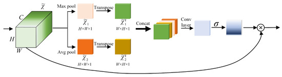Inspired by CBAM [18], this paper improves the SAM (Spatial Attention Module) of CBAM to Improved Spatial Attention Block (ISAB), whose architecture is shown in Figure 6, and the comparison between SAM (Spatial Attention Module in CBAM) and ISAB is shown in Table 1. Compared with SAM, ISAB also performed Max Pooling and Agv Pooling on the feature map output by ECA-Net, and it obtained and with the dimensions of two feature maps. In order to obtain rich spatial features, and are transposed to add two feature maps of size and obtain four feature maps. We concatenate these feature maps into a feature map group and then use the sigmoid function to obtain the weight of each feature point of the input feature layer. Finally, we use the feature weight to multiply the original input feature maps to obtain the weighted feature of ISAB.