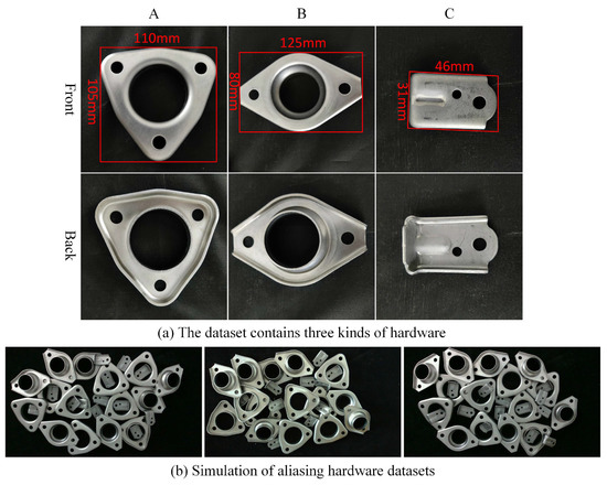 In order to simulate the robotic autonomous sorting and assembly scene of multi-category metal parts, three types of hardware with different sizes are chosen and aliased together, and then, a dataset of multi-category hardware aliasing has been constructed by some data augmentation methods. These three hardware (A, B, and C) included in this dataset are shown in Figure 7a, simulating a cluttered stack of hardware datasets for an industrial site, as shown in Figure 7b.