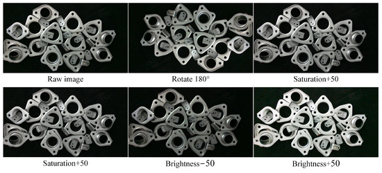 To construct the original dataset, 300 images are captured with a resolution of , and the shooting distance is set to 0.6–1.2 m, while the light source is the ordinary LED white light. Each image contains 15–35 shielding metal parts. Subsequently, referring to the paper [20], some dataset augmentation methods (including rotation, adjusted hue, changed saturation, and brightness, as shown in Figure 8) are used to expand the dataset to 1500 and to improve the generalization ability of the trained network model finally.