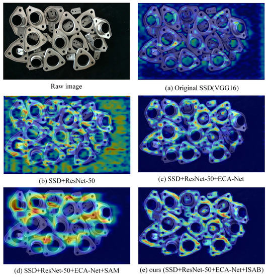 From the figure, it can be visualized that the original SSD algorithm (a) extracts the target feature information region showing a scattered state and focuses on useless features (background and image edges), leading to ignoring much of the target feature information. After replacing VGG-16 with Resnet-50 as the backbone network (b), the ability to extract features is significantly improved, but there are still a large number of redundant features. After that, the features extracted from the backbone network are weighted and filtered by using the existing attention mechanisms ECA-Net as well as SAM in the form of ECA-Net and ECA-Net+SAM, respectively. The heatmap (c) shows that the addition of ECA-Net can eliminate a large number of invalid features and improve the efficiency of feature extraction, but there are some parts with too few learning regions. The heatmap (d) shows that adding ECA-Net+SAM can involve more features and give higher weights than adding only ECA-Net, but there is a misconception of giving higher weights to the background. Therefore, the attention mechanism of ECA-Net+ISAB is proposed in this paper. It can be seen from the heatmap (e) that the region learned by the model after adding ECA-Net+ISAB is gradually concentrated in the part region and the redundant feature information is gradually reduced, indicating that the neural network proposed in this paper can better concentrate on the target learning region and reduce the interference of redundant feature information. The final experiments demonstrated that Resnet-50 and the attention mechanism are helpful to improve the learning ability of the SSD algorithm.