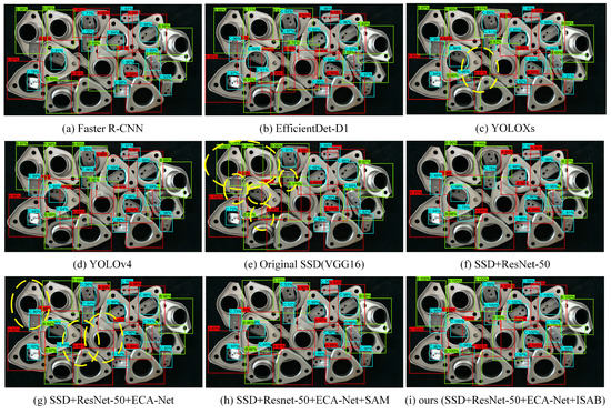 Figure 10 shows the recognition results of the nine algorithms. Comparing the detection results in the figure, the detection algorithm proposed in this paper not only has higher recognition accuracy and confidence for parts in complex and cluttered scenes but also locates the parts more accurately and has better detection performance for small objects. From (i), it can be seen that the ECA-Net+ISAB attention mechanism has a greater improvement than ECA-Net in the overall recognition performance of the network. The experimental results show that the algorithm proposed in this paper has superior overall performance to the other algorithms.