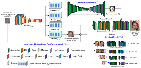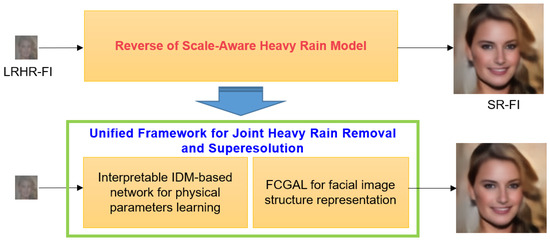 - This study proposes a unified framework for joint heavy rain removal and SR by employing an interpretable IDM-based network and FCGAL. For the inverse of the scale-aware heavy rain model, an interpretable IDM-based network is designed for physics-based heavy rain removal. In addition, for improved facial structure expressions, FCGAL is proposed for enabling the facial attention mechanism and learn local discriminators for facial authenticity examination.
