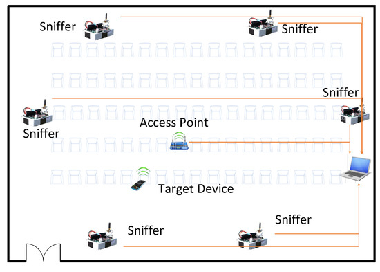 In this paper, as shown in Figure 1, we used the WiFi-based wireless ad hoc system for positioning (WiFi-WASP) [2,28,29] developed by the Commonwealth Scientific and Industrial Research Organization (CSIRO) of Australia for our experiments. We installed six custom-built WiFi sniffers as anchors for localization in a conference hall and placed an access point (AP) approximately in the middle of the conference hall. The sniffer measures the time stamp of the communication between the sniffers and the AP to estimate the clock offset and offset of the system clock. The sniffers also measure the time stamp of the communication between the target and the AP to locate the target. A computer was placed in the conference hall to collect time stamps collected by sniffers and estimate the location of target devices by using the TDOA. The system is passive and does not interfere with existing standard WiFi systems.