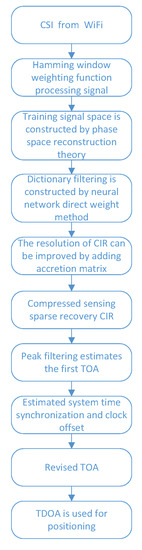 Figure 3 illustrates the steps taken to locate a target based on CSI collected by the considered WiFi positioning testbed. A Hamming window was first applied to the CSI to prevent frequency leakage. In order to estimate high-precision TOA, we used neural network weight determination method to filter dictionary atoms. The phase space reconstruction theory was used to reconstruct the input signal to address the problem of insufficient input training signals. The sparsity of dictionary was used as the sparse matrix of compressed sensing, and the resolution of TOA was improved by adding and expanding matrix. However, in a non-LOS or multipath environment, the first arrival path tends to decay significantly and its signal strength may be lower than the reflection path. A peak filtering algorithm was employed to improve the accuracy of estimated TOA. The system clocks among anchors were then synchronized and used to correct the measured TOA values. Finally, the target was located based on the differences between the TOA measured by different anchors.