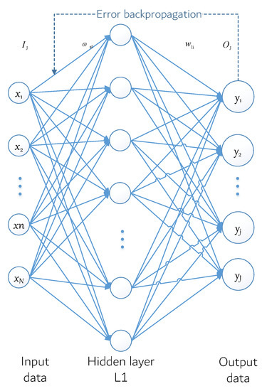 Neural networks with their massively parallel processing, distributed storage, and elastic topology, and other significant characteristics of highly redundant and nonlinear arithmetic, such as the control and nonlinear signal processing, pattern recognition, and robots, have been widely used in such fields as [37]. According to the model of the artificial neural network, the structure can be divided into a feedforward network (also known as a multilayer perceptron network) and the feedback network (also known as the Hopfield net). Among neural network models, the back propagation (BP) neural network model is one of the most widely used neural network models at present. Its core is the error back propagation algorithm, and its model is shown in Figure 4.