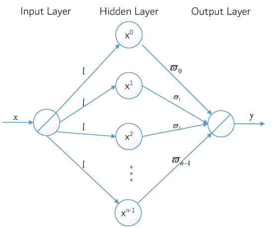 The BP network has some problems, such as a slow convergence, local minimization, and fixed learning rate. To solve these problems, Zhang yu-nong et al. proposed an improved power-excited forward neural network model by using polynomial interpolation and approximation theory [38]. Different from the traditional idea of obtaining neural network weights through lengthy BP iterative training, the direct weight determination method can directly obtain the weights, greatly shortening the determination time of network weights. It overcomes the inherent defect that the traditional iterative training algorithm is susceptible to a dynamic learning process and that it is difficult to determine the optimal topology of the neural network. This model can still be regarded as a BP neural network model, as shown in Figure 5. In this figure, the number of hidden layer neurons is n, and the connection weight between hidden layer neurons and output layer neurons is denoted as , but the relation between the input xand the output y of the neural network can be obtained as .