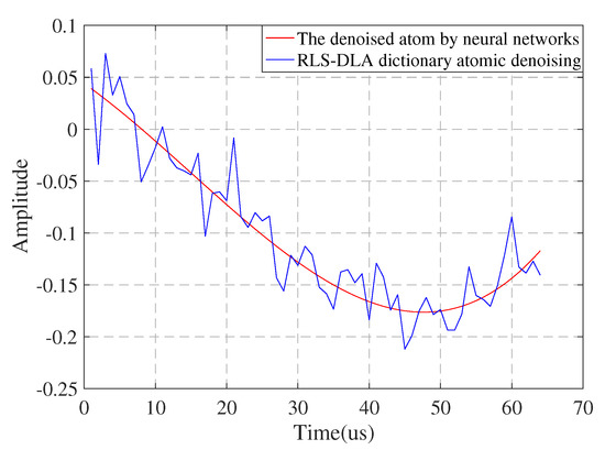 Regardless of using the recursive least squares dictionary learning algorithm (RLS-DLA), K-singular value decomposition (K-SVD)K-SVD, or other dictionary learning algorithms, as long as the training data contain noise, the resulting dictionary is bound to contain noise. In order to prove that the dictionary atom trained by RLS-DLA contains noise and verify the effect of dictionary learning by the direct weight determination method, we set the real quintic polynomial phase signal as the input signal, which can be expressed as