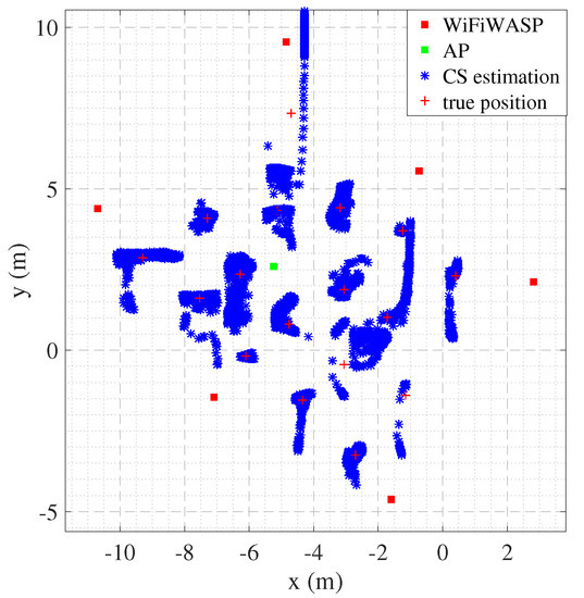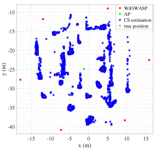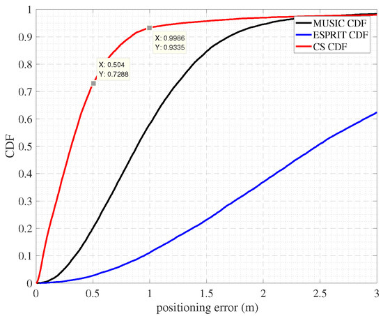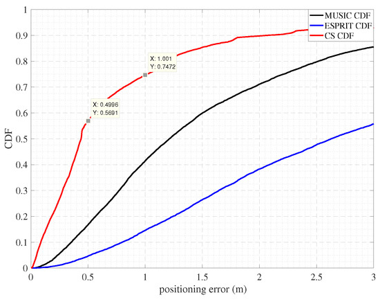 Figure 8 shows the positioning accuracy of our system when the TOA is estimated using the CS and MUSIC and ESPRIT algorithm. It can be seen that the 72-percentile positioning error is 0.5 m, and 1 m in 90% with the CS. Compared with MUSIC and ESPRIT’s TOA estimation methods, the accuracy of CS’s TOA estimation method is much higher.