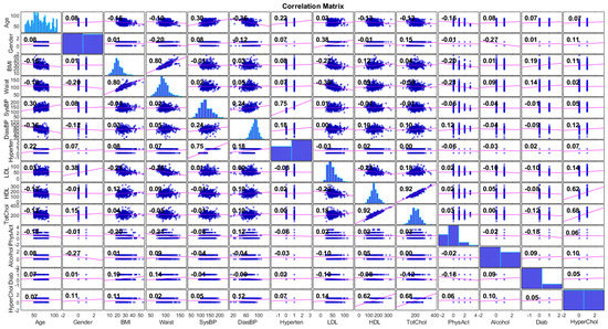 Moreover, the skewed class distribution constitutes a factor that can create ML models of poor performance. For this purpose, the imbalanced distribution of participants among the HyperChol and Non-HyperChol classes was tackled by employing SMOTE [43]. SMOTE uses a 5-NN classifier to create synthetic data on a minority class, i.e., HyperChol, which is oversampled such that the instances in two classes are equally distributed (i.e., 50%–50%). In Table 1, we present the minimum, maximum, mean and standard deviation of the numerical features in the balanced data.