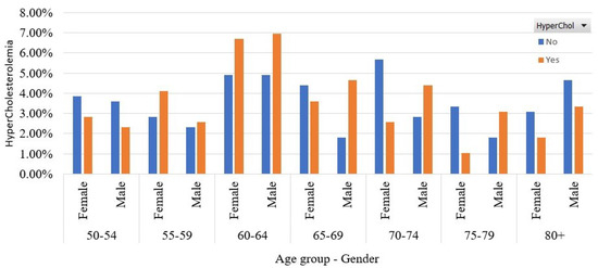 Initially, in Figure 2, we present the participants’ distribution according to their age group and their gender. Most of them who have HyperChol belong to the age group 60–64, where men’s and women’s percentages are approximately similar. In addition, from this figure, we observe that HyperChol prevails in women who are between 50 and 59 and men who are older than 65 years old.