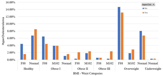 Cut-off points for the waist size were considered 88 cm for women and 102 cm for men [47]. Based on these points, the labels F88 and M102 capture women and men with waist circumference higher than 88 and 102 cm, respectively. The label “normal” refers to men and women with waist sizes lower than 88 and 102 cm, correspondingly. From this figure, we see that most of the participants with HyperChol are distributed in healthy and overweight and obese I categories of BMI. Moreover, when HyperChol and overweight classes coexist, the women with waists higher than the cut-off point are much more than men. In addition, some instances have HyperChol and are overweight, but they have normal waist size.