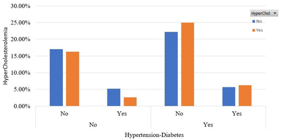 Furthermore, in Figure 4, we capture the coexistence of hypertension and diabetes diseases in relation to HyperChol. We see that 25% of the participants have HyperChol, are hypertensive and have not been diagnosed with diabetes. A small percentage of 6% fulfills all criteria; 16% of the participants who have HyperChol do not suffer from hypertension and diabetes.