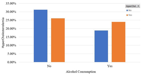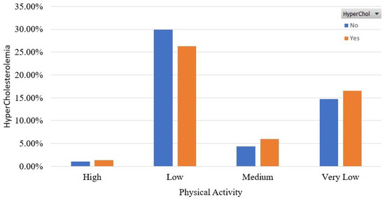 Figure 5 and Figure 6 show the association of HyperChol with participants’ habits in terms of alcohol consumption and physical activity. It is shown that the HyperChol participants are roughly the same distributed among the two possible values of the alcohol consumption feature. Finally, as for Figure 6, it should be noted that most of the HyperChol participants are very low or low physically active.