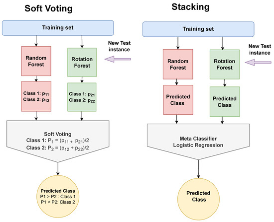 Ensemble Learning is a machine learning method that combines the outcomes of several single classifiers called base models. Voting and Stacking are two common approaches which are utilized to acquire more accurate predictions than the single models’. Concerning Voting, there are two types, Soft and Hard. Soft Voting, which is exploited in this study, averages the corresponding probabilities of the considered base classifiers and assigns a test instance to the class with the highest probability [58]. On the other hand, Stacking uses the predicted class labels of the base models as input features to train a meta-classifier which undertakes to find the class label [59]. Figure 7 illustrates the two schemes as they will be evaluated in the experiments.