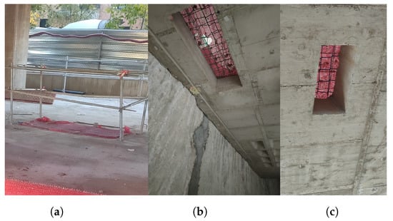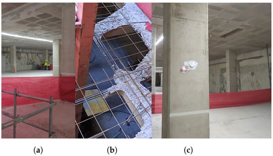 In this second experiment, we measured the location provided by the RPs one floor above and below the scenario. The first observation was that no signal was received from UWB. In other words, to have location in a floor, the UWB anchors must be installed in the same floor. Figure 6 shows the percentage of the packet loss of the RTT packets at the different points (1, 2, and 3) on the lower (Floor −2) and upper (Floor 0) floors of WiFi. These loss rates reflect a reliability that could be sufficient for non-critical applications; for instance, worker tracking or tool location which normally require update rates of a few Hz []. Half of the measurement points (Below 1 at Floor −2, Above and Below 3 at Floors 0 and −2, respectively) show a much higher loss rate due to the reinforcement concrete which block the signal. In one of the measurement points (Above 3 at Floor 0), no packets were recorded at all. In contrast, in the other half of the measurements (Above 1 at Floor 0, Above and Below 2 at Floors 0 and −2, respectively), the RPs can communicate with the smartphone due to some holes present in the structure of the building among different floors that are shown in Figure 7a–c.