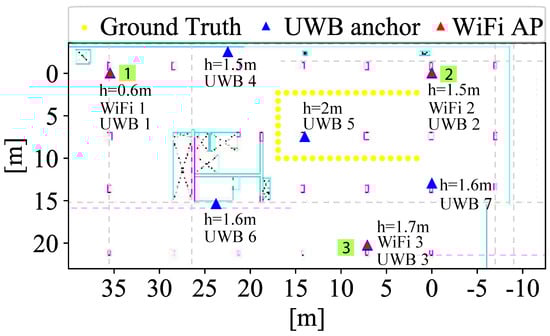 In the first experiment, the distribution of the UWB anchors and WiFi APs are represented in Figure 2 as blue and red triangles and indicated as UWB or WiFi X, respectively. The yellow dots represent the ground truth of the path there and back where the measurements are taken. In this experiment, all the measurements were taken in LOS conditions and for UWB4 and UWB6 in partially NLOS conditions. Two path there and back measurement recollections were performed to have a sufficient dataset, over 150 samples that were collected statically during each 30s measurement. UWB anchors are set at different heights (indicated in Figure 2) and the WiFi APs are placed on the floor to avoid falls. In the second experiment, the green boxes (1, 2, and 3) show the positions used to measure the penetration capabilities of UWB and WiFi one floor above and below of each point. In this experiment, we evaluate the penetration capabilities, i.e., the number of packets that can reach the UE, and the ranging accuracy of how it degrades from LOS to a NLOS scenario. In the positions marked by the green boxes, the UWB and WiFi devices are placed together on the floor (height = 0m). The measurement campaign at each point was of 5 min with an update date of 3 Hz.