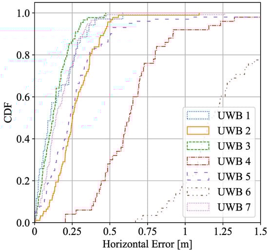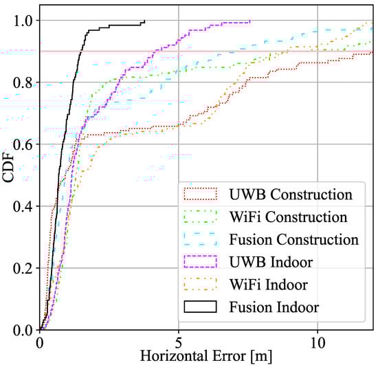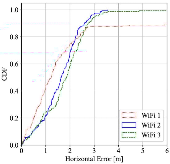 Figure 3 shows the cumulative density function of the horizontal error (x–y axes) as a result of trilateration obtained with UWB, WiFi, and fusion using trilateration. It also compares the performance with the indoor scenario (Case 1) presented in [].