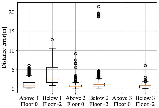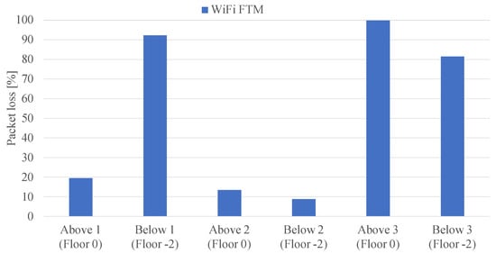 Figure 8 shows the ranging error (i.e., the error in the distance measured to the WiFi-FTM RP) for each of the measured points. It can be seen that the Above 2 at Floor 0 and Below 3 at Floor −2 are the most precise points, despite having high packet losses. In the points with lower packet losses, precision is slightly lower and there is a higher tendency for outliers. This is due to the impact of the holes in the building structure; while they help propagation, they also introduce a higher error due to multipath. The error maintains below 5 m of ranging error, despite the fact that in some cases the packet rate loss exceed the 80% of the transmitted packets. This means that in cases where only signal penetration is available for positioning, the ranging error maintains stability in general.