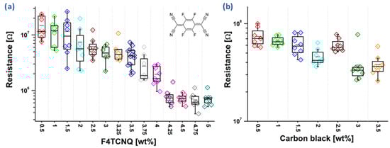 (a) Box plots of F4TCNQ-doped polyaniline sensor units, the insert shows the chemical structure of F4TCNQ; (b) box plot of carbon black-doped polyaniline sensor units.
