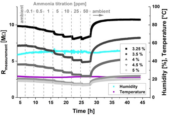 A titration of ammonia solutions, resulting in gas phase concentrations of 0.01, 0.5, 1, 5, 10, 25, and 50 ppm in a Liquid Calibration Unit (LCU), was performed for PANI sensors doped with F4TCNQ concentrations ranging from 3.25%, 3.5%, 4%, 4.5%, and 5% (wt%), and the results are shown in Figure 3. Simultaneously, the y-axis in Figure 3 was calculated from the differential principle of the sensor units, assuming that the reference channel (beforehand passivated) did not change during the experiment, to obtain the total resistance value, as shown in Figure 3. It can be seen that the initial sensor resistance is indeed in good agreement with the dopant concentration, as shown in Figure 1. At the same time, a decrease in response amplitude (sensitivity) is observed with increasing dopant concentrations. The dependence of the response on the dopant concentration is shown in Supplementary Materials Figure S2, where the responses were normalized as a percentage of the sensor resistance. For all sensor units, a similar time constant is observed in which the initial sensor response is almost instant, but the system requires about 15 min before reaching equilibrium conditions (Supplementary Materials Figure S3 and Section S6). Such slow kinetics clearly point at a diffusive adsorption process in the porous structures of the bulk sensing material, which agrees with the observations shown in Figure 2. Furthermore, the dependence of the sensor noise level on the dopant concentrations was analyzed, showing that the lowest doping levels exhibit the highest noise, with signal standard deviations of 5557, 3616, 1943, 924, and 661 ohm, measured over a time span of 10 min for dopant concentrations of 3.25%, 3.5%, 4%, 4.5%, and 5% (wt%), respectively. Due to the principle of data recording and the resolution of the sensor signals with a 16-bit analog-to-digital converter, the noise level of the highest dopant concentrations was not fully resolved. The results of the titration experiment show that, for an ammonia concentration of 100 ppb, the PANI sensors doped with 3.25%, 3.5%, and 4% (wt%) F4TCNQ exhibit a signal-to-noise ratio above three, hence the limit of detection (LoD) according to the IUPAC definition for these sensors can be estimated to be around 100 ppb ((∆I/I0)mean ± kσ). The polyaniline sensors doped with 4.5% and 5% (wt%), on the other hand, showed a diminished reaction to such low NH3 concentrations, and the LoD was 500 ppb and 1 ppm, respectively. However, using a higher ADC bit depth resolution and an incremental ΣΔ modulator to resolve the dynamic part of the sensor signal could further decrease the LoD of the sensors with higher dopant levels []. The SNR will be improved due to increased signal resolution and the usage of more bits for the dynamic section of the signal, hence allowing for investigating minute polymer conductance changes []. A comparison to other sensor platforms using nanocrystalline zinc oxide sensors shows that the addition of aluminium as a dopant increases the sensitivity for hydrogen detection with an optimum increase for an addition of 3% []. Furthermore, other investigations show that CuO thin film sensors exhibit the highest sensitivity, with an addition of around 3% of Lanthanum in a sol–gel method fabrication process []. Interestingly, lower and higher dopant concentrations do not result in better sensor performance. The authors hypothesize that resulting grain sizes and surface area increases play a significant role for this effect. Moreover, the depletion region extends deeper in the bulk. However, with increasing bulk conductivity, a shift in depletion region thickness has less influence on the film conductivity, hence decreasing sensitivity. We contemplate that a trade-off of these factors results in a maximum sensitivity at a low dopant concentration for the above-mentioned studies. Furthermore, our study does not support these claims, since the addition of dopant concentrations in a PANI solute does not necessarily increase the surface area of the resulting films with the fabrication method described in this work. In previous work [], we demonstrate the influence of heating temperature, and annealing parameters on PANI sensor sensitivity, which is in good agreement with the explanations cited above. Hence, the results shown in Figure 1 exhibit only one of the sensitivity scaling effects, with the highest sensor sensitivity for the lowest dopant concentration. To the best of our knowledge, no investigations on the sensitivity of PANI films for gas sensing in the dependence on dopant concentration were previously conducted, and similar studies on other material films do not include any information on the fabrication reproducibility of the dependence on the dopant concentration. Comparing the titration experiment results to literature, the lowest concentrations of ammonia detected were in the ppm regime for polyaniline films [], 1 ppm for graphene/polyaniline composites [], 1 ppm for acrylic acid-doped polyaniline [], and 5 ppm to up to 100 ppm for polyaniline-based sensing elements, as summarized in a recent review by Tanguy et al. on polymer sensors for ammonia detection []. For PANI on a bacterial cellulose being used as a wearable sensor substrate with co-dopants of sulfosalicylic acid (SSA) and poly (2-acrylamido-2-methyl-1-propane sulfonic acid) (PAMP), a LoD of 10 ppb to ammonia can be reached []. PANI composites blended with PMMA/PS and MWCNT are found to have a LoD of 830 ppm when considering an ammonia detection []. A summary is shown in Table 1.