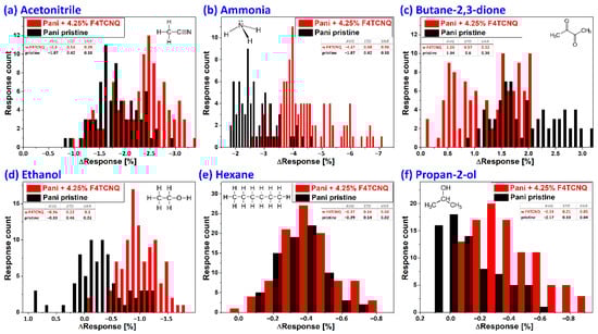Histogram (bin sizes 0.1%) comparison of sensor responses to six different analytes with pristine polyaniline films (black bars) and PANI films doped with 4.25 wt% F4TCNQ (red bars). (a) Acetonitrile responses; (b) ammonia; (c) butane-2,3-dione; (d) ethanol; (e) hexane; and (f) propan-2-ol.