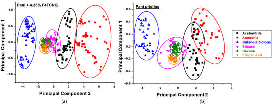 From the distribution of data points in Figure 5, again a clear difference between pristine PANI (b) and F4TCNQ-doped PANI films (a) can be observed. Although the dataset for the doped sensors was slightly bigger, in contrast to pristine PANI sensors, almost no overlaps in the principal component representation are observed for the clusters of ammonia and acetonitrile. Additionally, for the tighter packed data clusters of ethanol, hexane, and propan-2-ol, which all had significantly lower sensor responses, a distinction of the chemical classes is much better when using doped PANI films since the principal components of ethanol are less scattered.
