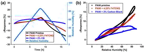 For the application of polymer gas sensors in real-world conditions, the sensor signal dependence on the environmental conditions is of paramount importance. Apart from the sensor response, a hysteresis behavior of the sensor system can also be observed for polymeric sensors []. Previous studies show that polymer-based humidity sensors suffer from large hysteresis between absorption and desorption of moisture, which is a challenge, since it may lead to deformation of the polymer and thus affect the sensor performance adversely []. To evaluate the sensor dependence of pristine PANI, carbon black-doped polyaniline, and F4TCNQ-doped polyaniline, a gradient of the relative humidity environment was performed as described in the Materials section. The sensors were exposed for 8.5 h to an increasing RH from 10% up to 90%, followed by a decrease in RH from 90% down to 10% again. To achieve this, the flow rate of the second channel on the LCU was incrementally adjusted so that a gradient of relative humidity (RH) was achieved. From these curves, the humidity vs. sensor response curves were plotted for the increasing and decreasing regime of RH, and the result is shown in Figure 6.