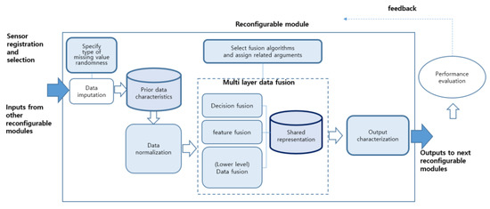 An RM’s input is either raw data or output transferred from another RM. To deal with data inconsistency, an appropriate data imputation algorithm is applied according to the random nature of the missing values in the raw data. The parameters required for setting the internal structure of the RM include data normalization, data fusion architecture, a fusion algorithm, and the internal representation and output characteristics of each fusion layer. RM reconfiguration means to create a new RM instance by setting these parameters.